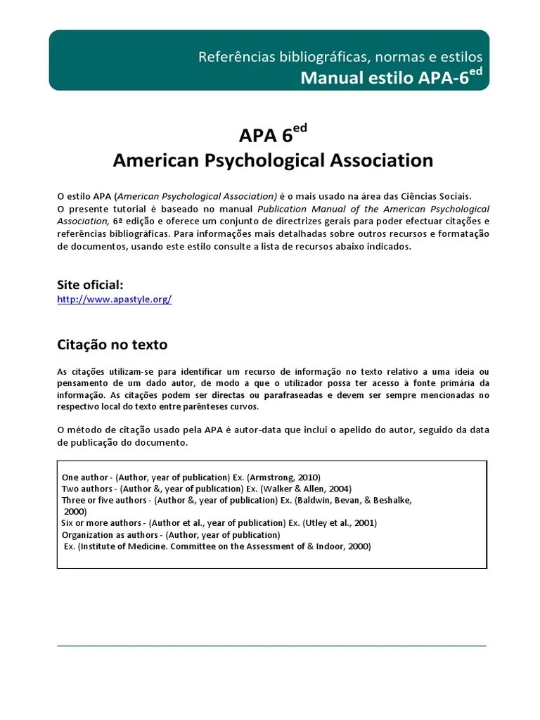 Para citações, o padrão apa considera a variação de um a cinco autores, ou mais, incluindo também instituições, com destaque para a 1ª vez em que ocorrer determinada citação e as subsequentes, relacionadas ao mesmo autor ou instituição e mesmo ano... .. One complete reference for each source should appear in the reference list at the end of the paper.